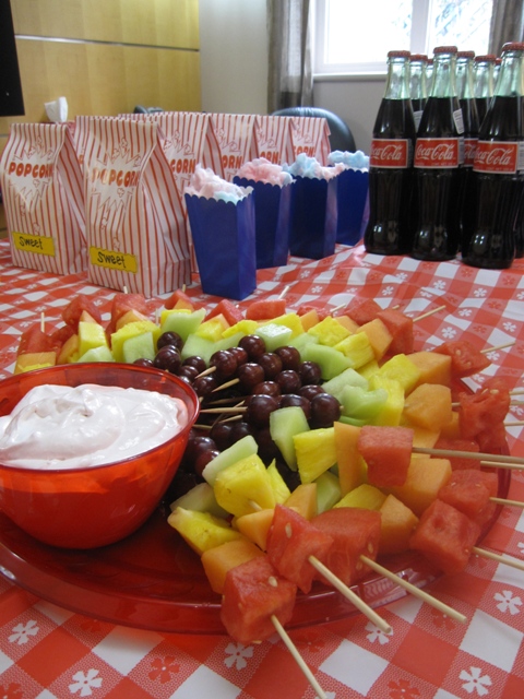 every time we hire a new employee at work, the party planning committee (me and the office manager) try to host an event to welcome the newbie to the team. i've always been a fan of a themed parties (i once threw a murder mystery holiday party), so this time we went with a carnival theme. we served all the traditional carni foods you would expect - nachos, cotton candy, popcorn and old-fashioned coke bottles. i also made rainbow fruit skewers and strawberry fruit dip for the more health-conscious. we set up a buffet table for the occasion, but unfortunately the nachos couldn't go on the table because they had to be plugged into an outlet since we served it in a fondue pot.